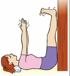 ●仰向けに寝て、両足をまっすぐ伸ばして、かかとは壁にくっつけます。(お尻も壁にくっつけます)